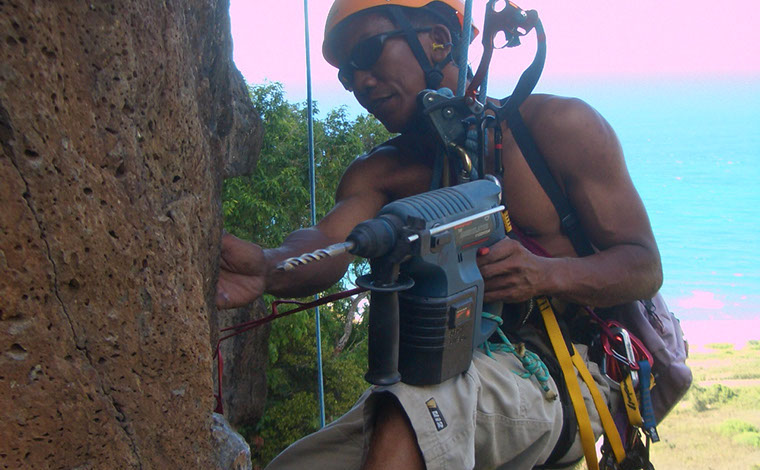 Climb Aloha team member Robot installing new bolts at Makapu'u for the community to use.