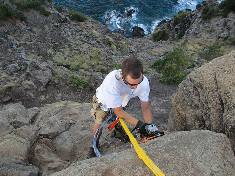 Climb Aloha team member Robot installing new bolts at Makapu'u for the community to use.