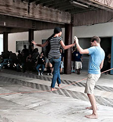 After everyone is feeling comfortable, we break off into groups and begin walking. The rest of the class focuses on walking or practicing poses. By the end, everyone will feel comfortable on a slackline, and have learned enough technique to be able to do yoga poses on a slackline – if not walk all the way across!
